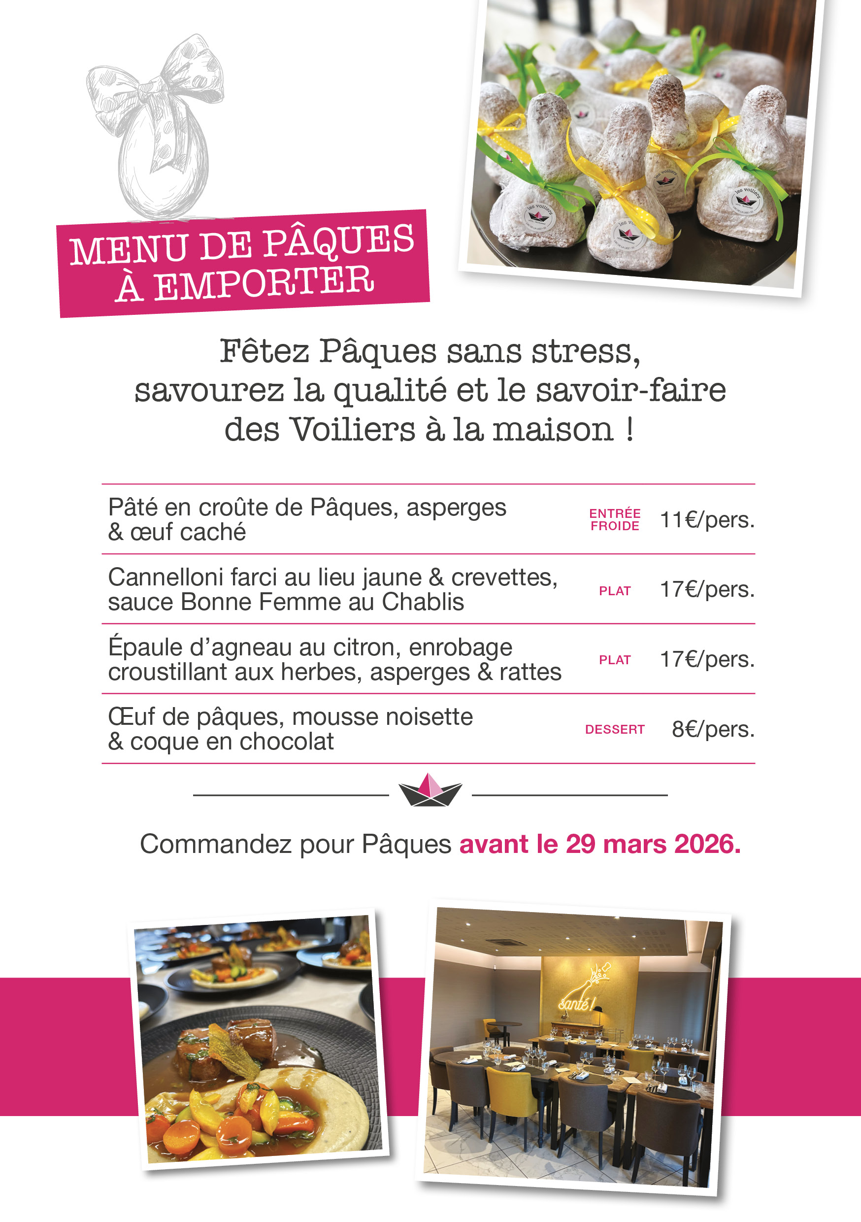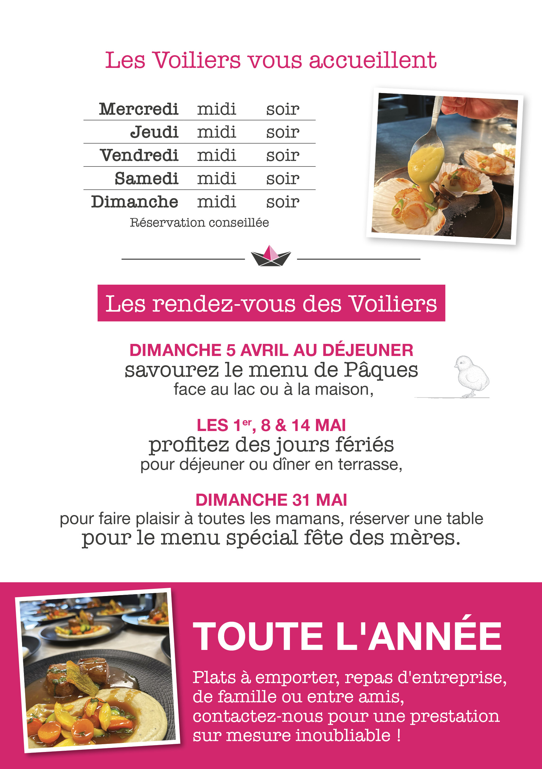menu à emporter Les plats à emporter Les voiliers s’invitent chez vous ! Régalez vos convives et votre famille avec nos plats à emporter. Contactez-nous pour un menu sur mesure à emporter à la hauteur de vos évènements. Chaque année retrouvez également nos cartes de plats à emporter pour les fêtes de fin d’année, pour la Saint-Valentin & pour Pâques. Pour toute demande de menu : 03 25 87 05 74 accueil@lesvoiliers.fr La carte des fêtes Plats à emporter